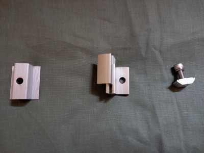 päätykiinnike säädettävä 1,40 e, pultti +kiskokiinnike 0,20 e (itse käytän vain torx ruuveja ja kyllästettyä 50 x 50 mm puuta, en siis kiskoa )